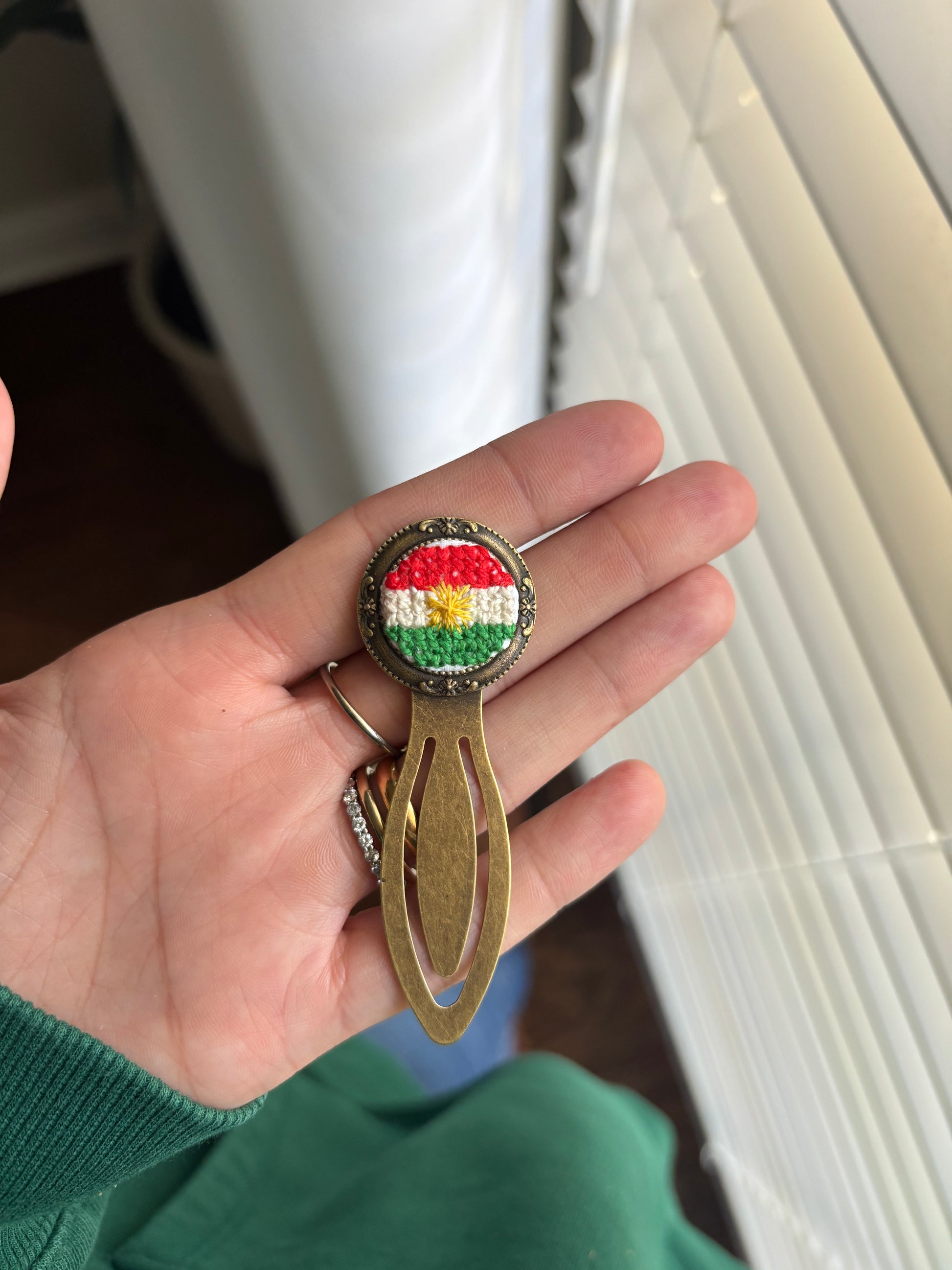 These antique bronze toned bookmarks add a personalized touch to your reading. Each of the circle portions are ‘filled’ with a hand embroidered design or tatreez motif. Custom orders or personalized options are available upon request. Let me know if you have any questions at all!