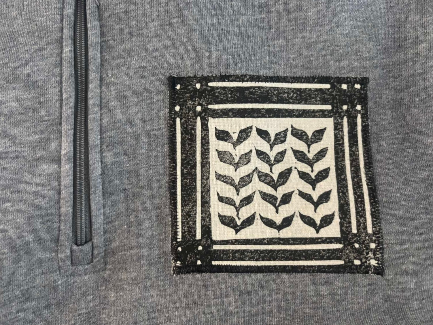 This unisex style sweatshirt includes a hand block printed cotton patch sewn on to the front pocket area of the coziest cotton/polyester blend. It displays both the patterns of olive leaves and bold lines. The olive leaves symbolize the economic and cultural significance of olives in Palestine, as well as the strength and resilience of the Palestinian people themselves. The bold line pattern represents the historical natural and cultural merchant exchange/trade routes throughout Palestine. A mini Palestinian flag patch is sewn on to the right sleeve.